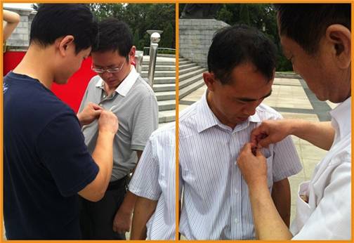 進入陵園后,在公司黨支部書記萬全進的帶領下,恒通公司全體黨員在革命烈士紀念碑前重溫入黨誓詞,隨后舉行了對預備黨員鄧輝轉正,同時吸收余招輝、黃東明為預備黨員的宣誓儀式,由萬全進書記和劉清元副總經理分別為兩位預備黨員佩戴黨徽。
